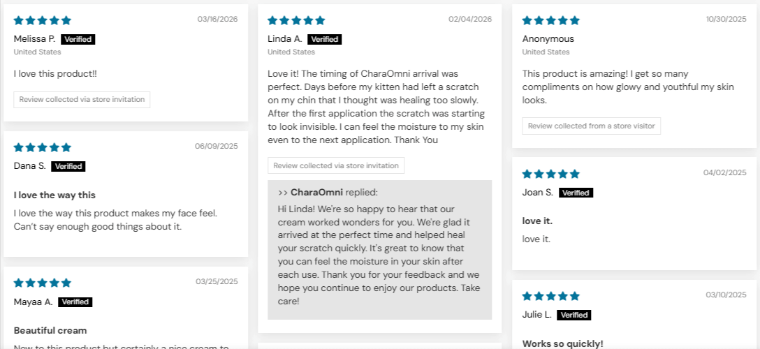 - Jeanne S. admitted she was “somewhat skeptical” before trying CharaOmni. She described the cream as “calming, moisturizing and satisfying to the skin” and confirmed it was non-irritating.